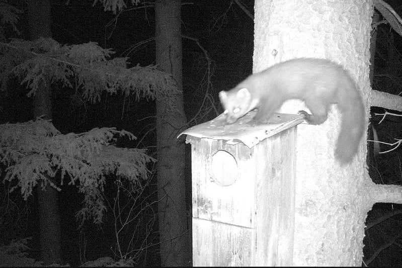vom April dieses Jahres zeigen wiederum den Waldkauz, allerdings auch Aufnahmen vom Baummarder ( zu erkennen an den Ohren, sowie am Brustfleck ). Festzustellen ist, daß der Brutversuch im Jahr