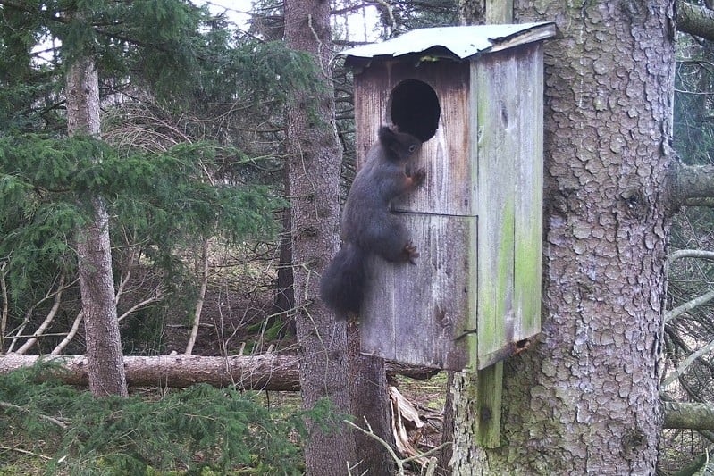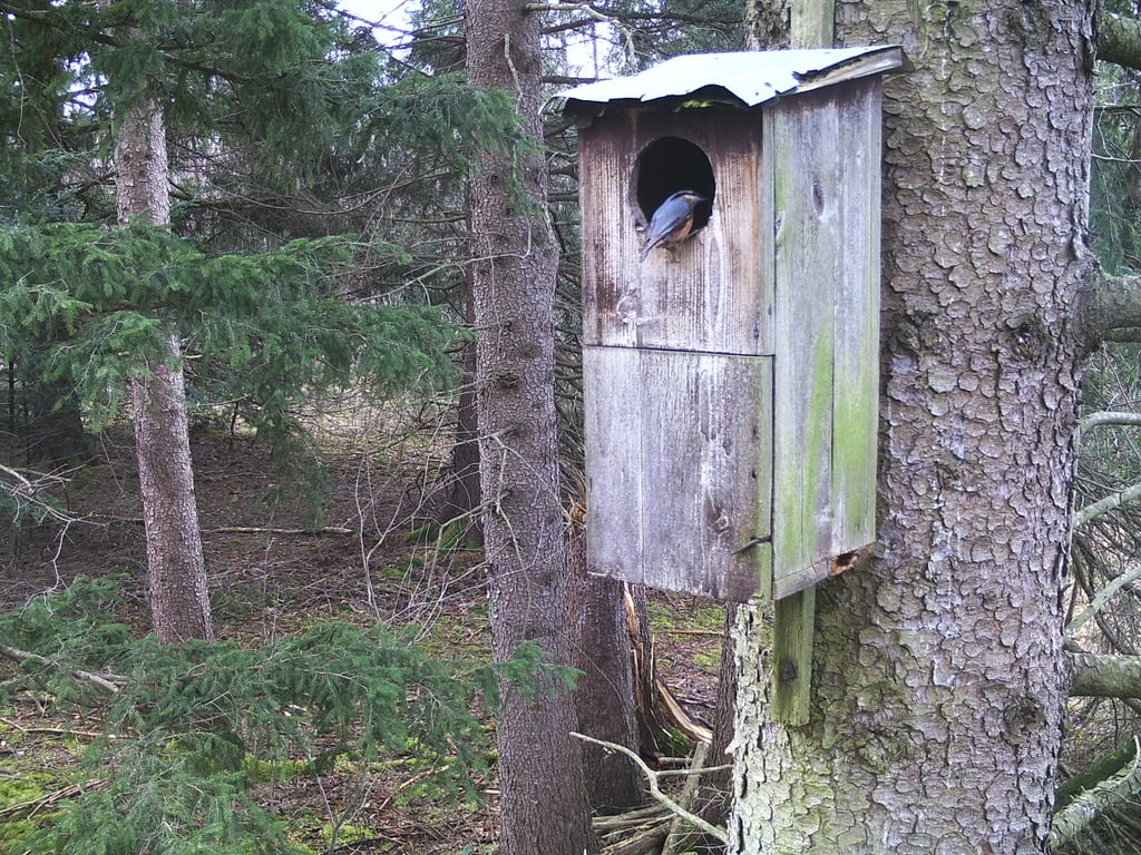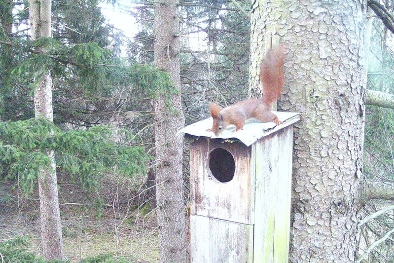 Mitte Februar besichtigte ein Waldkauz nachts interessiert den Kasten. Tagesaufnahmen belegen auch weitere Interessenten des Kastens, wie Eichhörnchen, Kleiber und Kohlmeise. Weitere Fotos