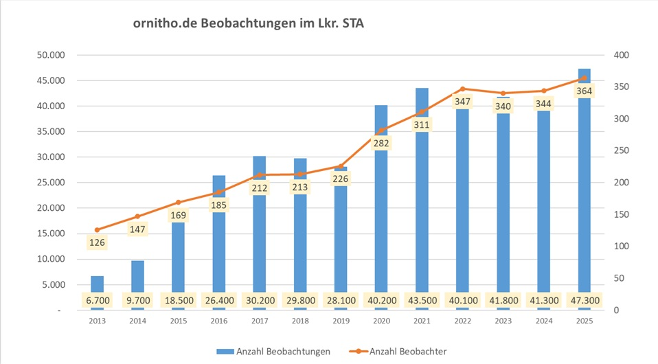 Im Jahr 2025 wurden für den Landkreis Starnberg ca. 47.300 Beobachtungen von ca. 360 Beobachtern im ornitho.de registriert.
