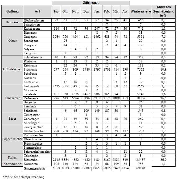 Der mit Abstand größte Anteil an Wasservögeln über die Wintermonate wird mit 41,7 % von den Blässhühnern gebildet. Die Art mit der zweithöchsten Individuen-Summe der letzten zehn Jahre ist die