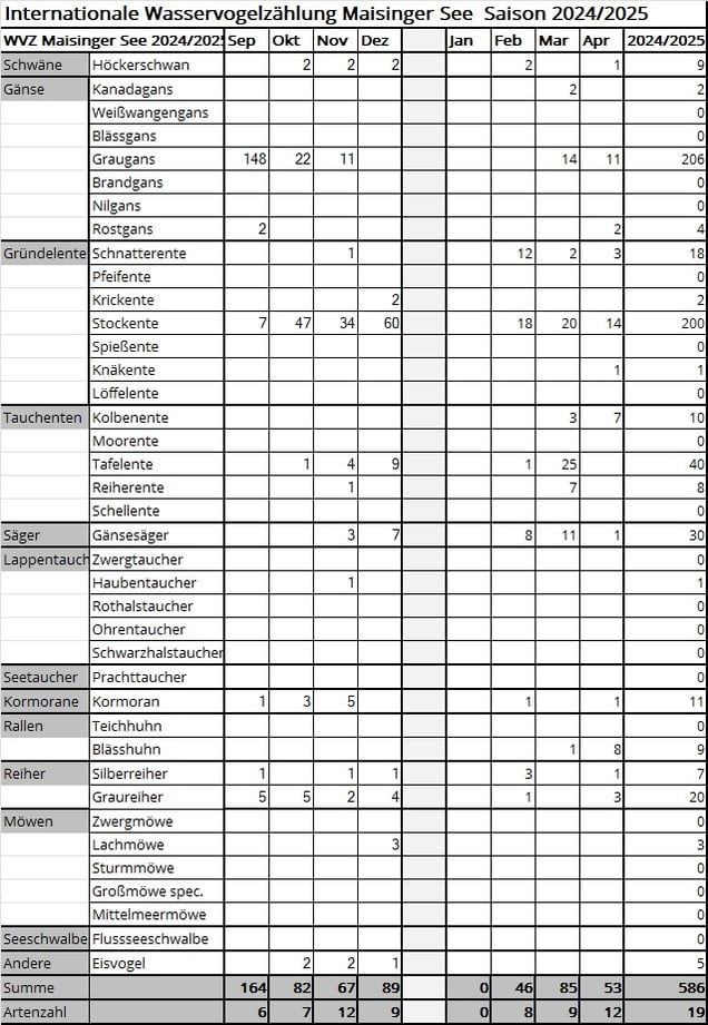 Nachdem der Maisinger See auf Grund seiner äußerst geringen Tiefe in nahezu jedem Winter zufriert, spielt er für rastende Wasservögel nur eine untergeordnete Rolle. Lediglich im Spätherbst bis
